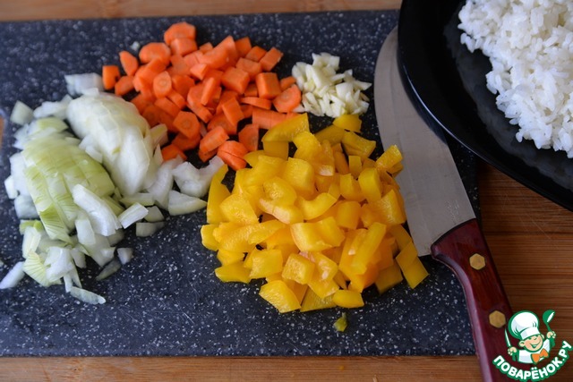 Одновременно чистим овощи: лук, морковь, болгарский перец, чеснок. У меня был в наличии только жёлтый перец, значения не имеет. Овощи режем мелкими кубиками.