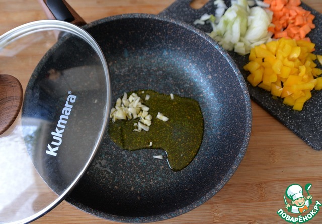 Берём сковороду, у меня ТМ KUKMARA, наливаем растительное и кунжутное масло, кладём чеснок, нагреваем до появления лёгкого аромата.