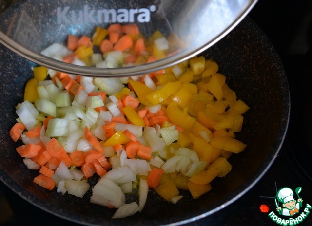 Кладём лук, морковь, болгарский перец. Перемешиваем овощи, тушим на среднем огне 10 минут. Сковорода ТМ KUKMARA очень удобна в эксплуатации, она имеет антипригарное покрытие, в ней ничего не прилипает и не пригорает. Сковорода равномерно прогревается. Ручки сковороды и крышки удобны и не нагреваются.