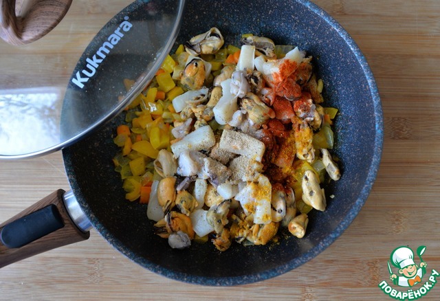 Кладём к овощам морепродукты, добавляем по вкусу соль, белый перец, куркуму и паприку. Наливаем белое сухое вино, можете не добавлять, конечно, но оно придаёт вкус и аромат, градусов не имеет после термообработки.
