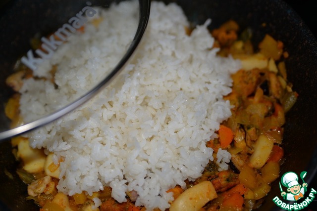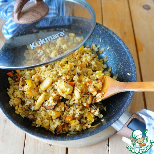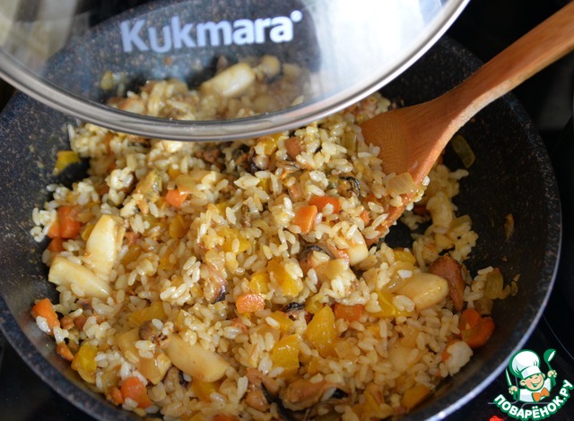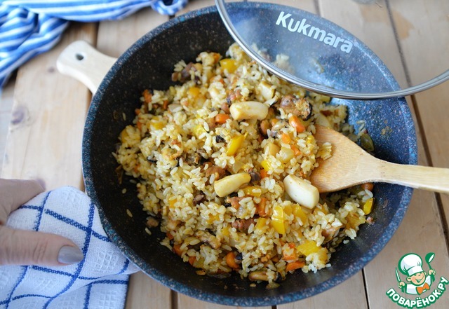 В интернете этот рецепт описан, как диетический плов по Дюкану. Не буду строго утверждать, хотя, в общем-то, это и не плов вовсе, а рис с морепродуктами. Но в любом случае, это очень вкусно. А поможет нам его приготовить антипригарная сковорода ТМ KUKMARA.