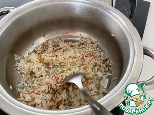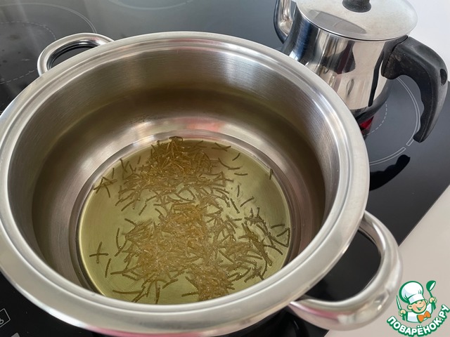 2. В емкость (в которой будем готовить) наливаем растительное масло без запаха и добавляем 1 ст. л. без горки вермишель-паутинку. Постоянно перемешивая, обжариваем до потемнения.