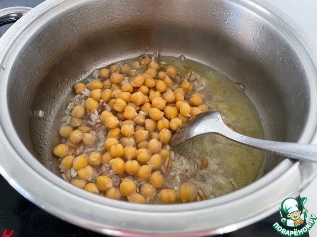 Нам потребуется отваренный нут. Для этого замачиваем его на ночь в большом количестве воды, утром отвариваем в течении 45 минут. Рис кладем в глубокую емкость, добавляем столовую ложку соли и заливаем 2 стаканами кипятка. Оставляем на 15 минут, крышкой не накрываем.