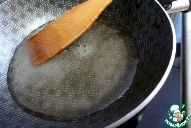 В глубокой сковороде (ковшике, сотейнике) растворить в воде сахар и довести до кипения.