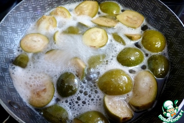 Довести до кипения и томить пока ягоды не поменяют цвет с зелёного на оливковый. Ягоды слегка уменьшатся в размерах и пустят сок.