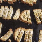 Совет: в целях сокращения времени подготовки крутонов, сначала смазать целые ломти хлеба масляной смесью, а затем нарезать на полоски.