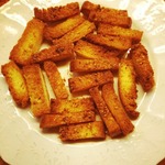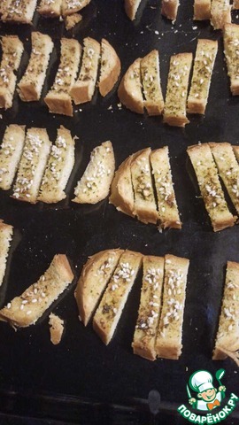 Идея приготовления крутонов в виде палочек была подсмотрена на японском кулинарном сайте и адаптирована под свой вкус. Сейчас вместо гренок к супу и салатам готовлю такие вот крутоны. Плюсы очевидны: и вкуснее и выглядят поинтереснее обычных гренок.