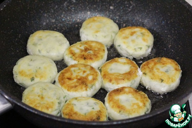 С сковороду влить немного растительного масла, разогреть его и обжарить сырники на небольшом огне с двух сторон до золотистого цвета.
