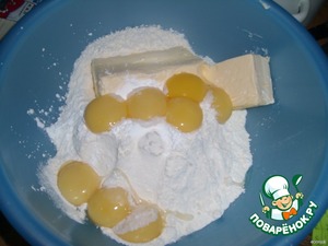Делаем тесто из 4-5 стаканов муки, 1,5 пачки маргарина «Пышка», 2-3 ст. л. разрыхлителя, неполного стакана сахарного песка, 8 шт. желтков, 2 ст. л. сметаны, соли на кончике ложки. -