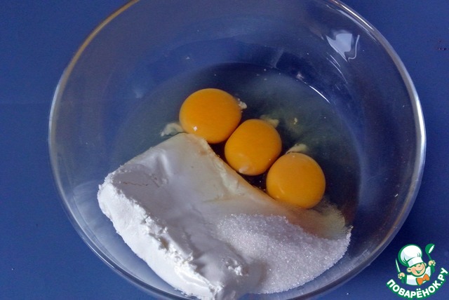 К творогу выложить яйца и сахар.