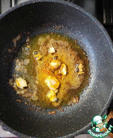 Растопить сливочное масло, опустить в него специи, обжарить в течение 10 секунд.