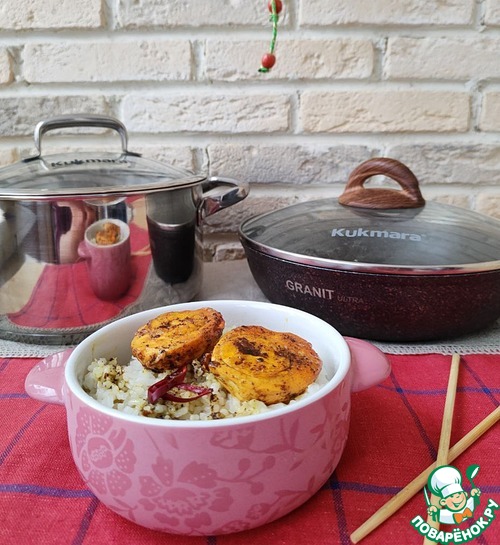 Для приготовления этого блюда я использовала посуду ТМ Kukmara. Это кастрюля из нержавеющей стали 3л со стеклянной крышкой, линия "Leon" и сковорода 24 см со съемной ручкой, стеклянной крышкой, АП линия "Granit ultra". Посуда отличная! Нисколько не уступает аналогичным зарубежным образцам. А для меня так и лучше. Роднее потому что.