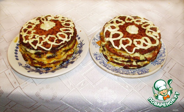 Получившийся тортик сверху украшаете майонезом и подаете к столу. Подавать можно теплым или холодным.