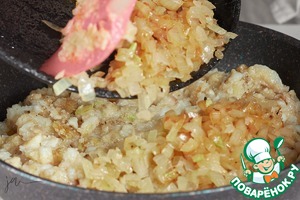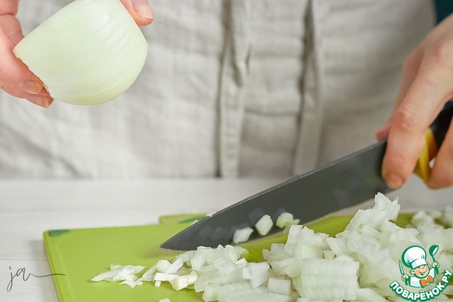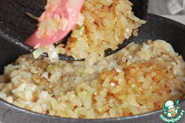 Лук нарезать мелким кубиком и обжарить на отдельной сковороде на растительном масле.