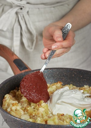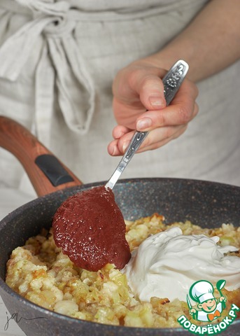 Добавить томатную пасту, сметану и немного воды. Потушить минут пять-семь.