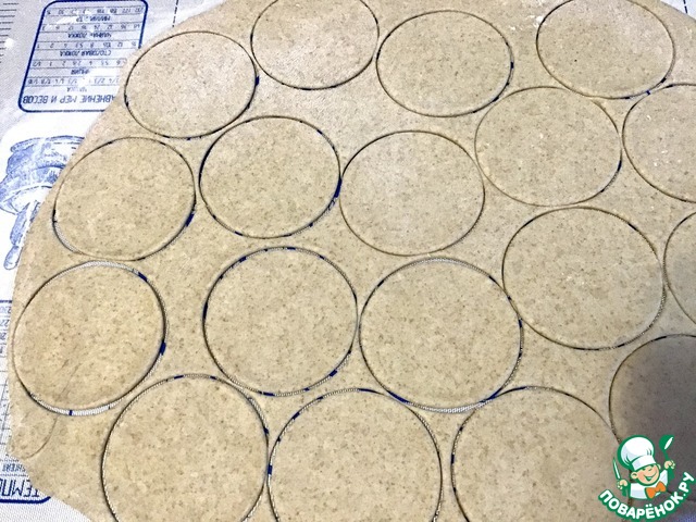 От теста отделить примерно третью часть, остальное оставить в пакете. Тесто раскатать на присыпанной мукой поверхности толщиной примерно 1 мм. При помощи стакана или формы для печенья вырезать кружки диаметром 6 см.