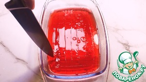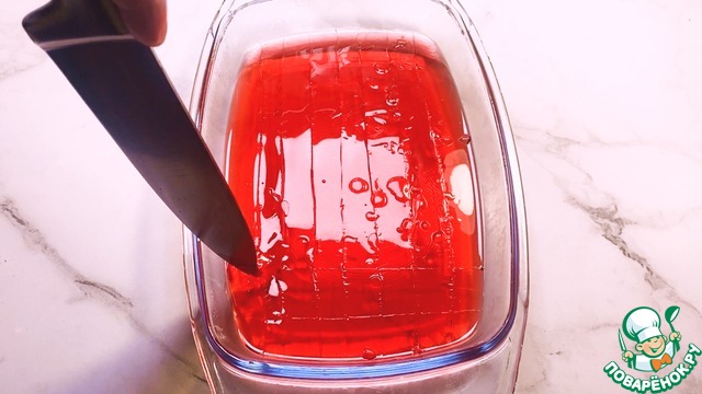 После того как желе застыло, нарезаем его на небольшие кубики.