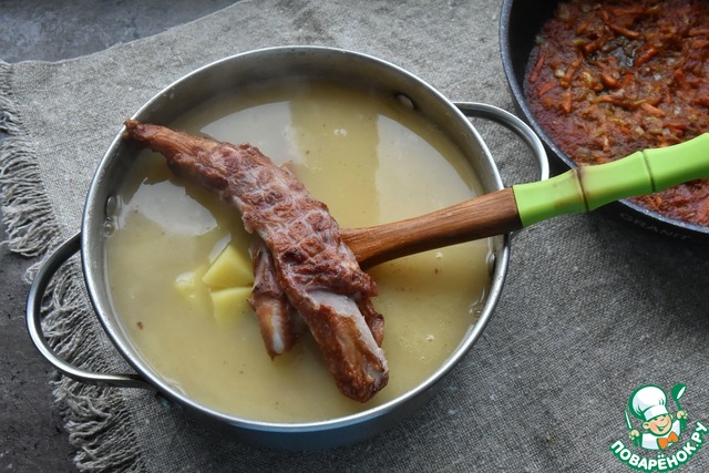 На данном этапе можно отправить в бульон копченые ребра, отложенное отварное мясо. И начинайте магическое преображение супа.