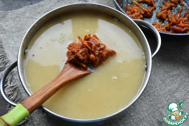 По готовности картофеля добавьте супу вкус и аромат. Переложите обжаренные со специями лук и морковь.
