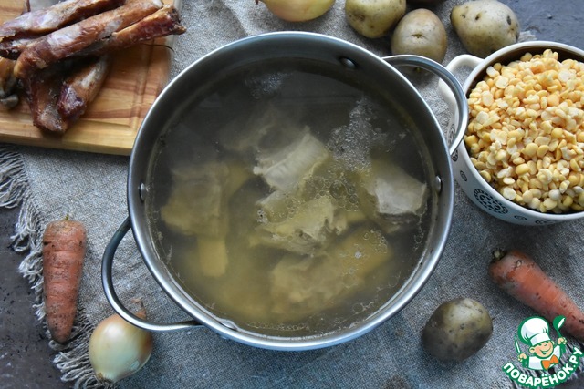 Когда бульон будет готов, достаньте из кастрюли мясо и засыпьте промытый горох. Варите 90 минут. Горох должен полностью свариться и даже развариться придавая бульону густоту.