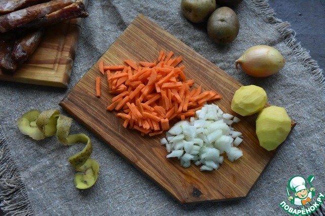 Очистите и нарежьте овощи. Мелким кубиком нарежьте репчатый лук, соломкой морковь, картофель крупным кубиком.