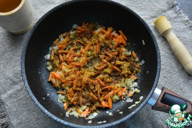"Потушите на растительном масле лук и морковь. Всыпьте смесь из перетертых специй. Добавьте измельченные томаты в собственном соку и потушите до загустения."
