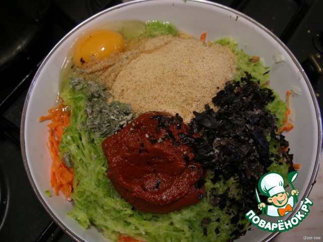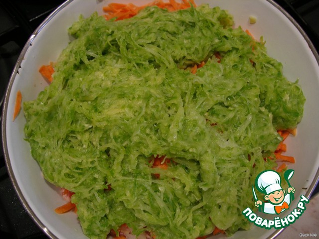• 3. тертый кабачок. Тут надо смотреть, если кабачок слишком водянистый, то его следует чуть отжать. Можно использовать и замороженный. Тогда его надо разморозить, отжать и измельчить в блендере.
