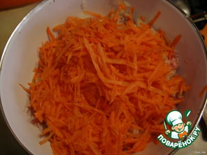 • 2. тертую на крупной терке морковь. Можно натереть и на мелкой, она будет менее заметна уже в готовом виде.