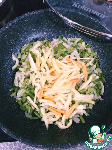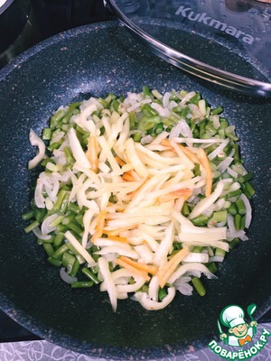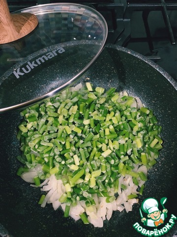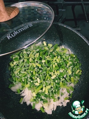 На растительном масле обжариваем лук до прозрачности, добавляем стрелки, обжариваем 3-4 минуты.