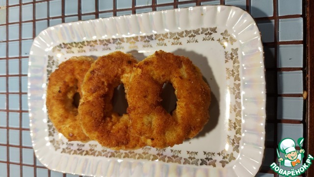 Затем окуните их в яйца. И выложите в миску с панировочными сухарями.