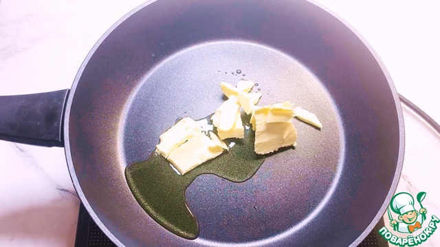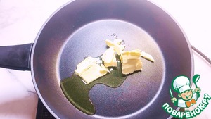 Первым делом на раскаленную сковороду отправляем сливочное и оливковое масло.