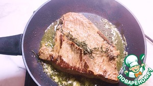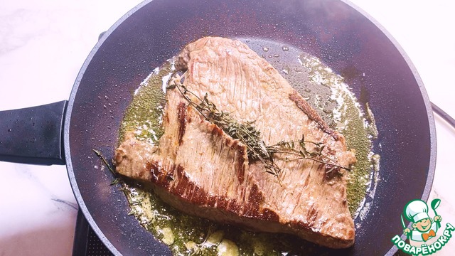 Кладем стейк, веточки тимьяна и обжариваем по 4 минуты с каждой стороны.