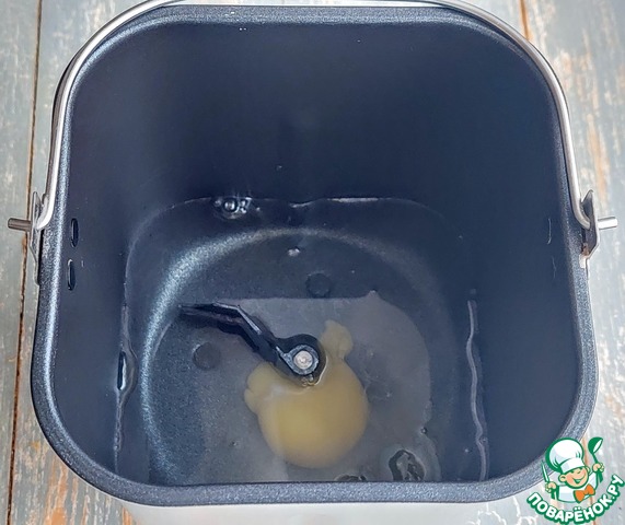 Тесто я буду замешивать в хлебопечке. В ведёрко хлебопечки вылить горячую воду (не больше 60-70 градусов), добавить яйцо и соль.