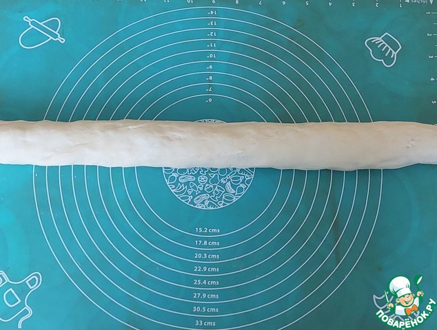 Рабочую поверхность присыпать мукой. Тесто разделить на 2 части. Каждую часть раскатать, как можно тоньше.
