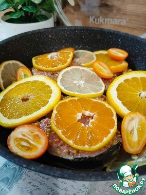 Сковороду ТМ "Kukmara" слегка смажьте оливковым маслом. На дно выложите несколько кружочков цитрусовых. Поверх подготовленную рыбу.