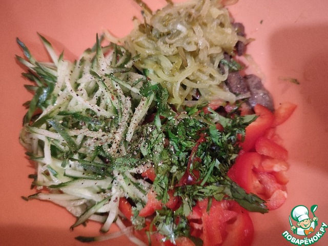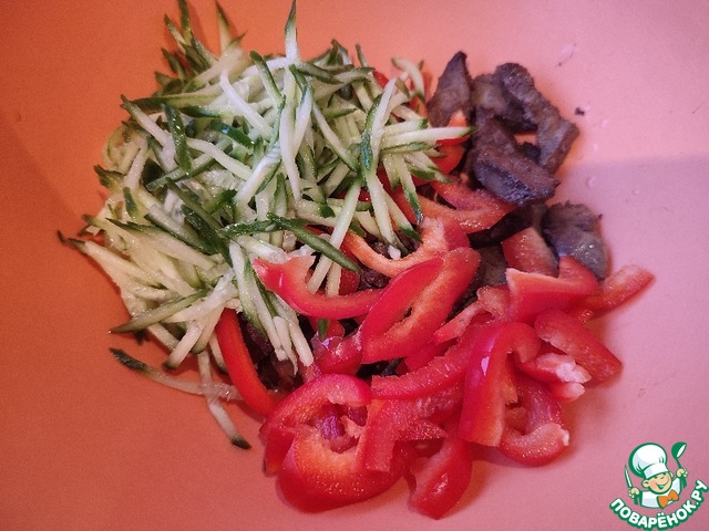 Печень немного остужаем и добавляем к ней перец, нарезанный тонкой соломкой и огурец (натертый на терке, у меня для моркови)