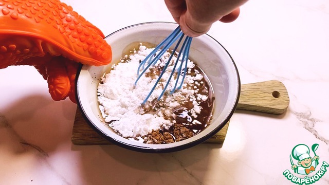 В кокосовое масло добавляем какао, сухое молоко, сахарную пудру и хорошенько все перемешиваем.