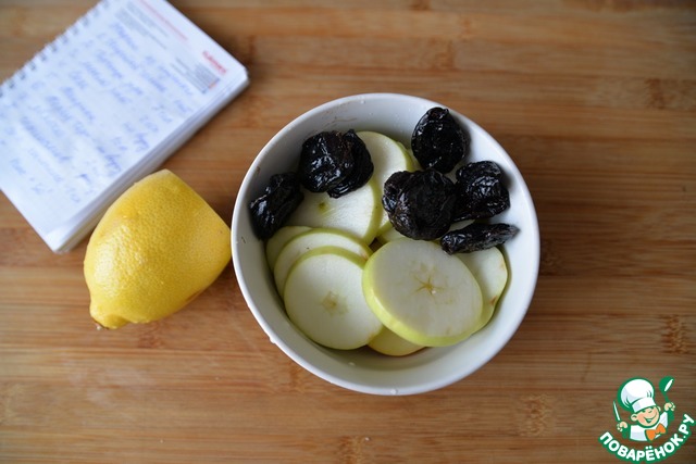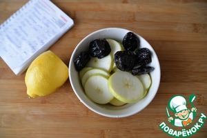 Берём яблоки, у меня одно кислое, другое кисло-сладкое. Убираем косточки, режем кружками. Добавляем чернослив, если он сухой, то предварительно замачиваем. Я обычно заливаю водой и ставлю в микроволновку на 1 минуту. Поливаем яблоки и чернослив соком лимона.