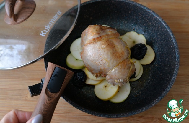 Берём сковороду с оставшимся маслом. Сковорода ТМ Kukmara Granit Ultra удобна тем, что имеет съёмную ручку. И далее запекать можно в той же посуде, что и предварительно готовили. Кладём в сковороду яблоки и чернослив, сверху кладём голень индейки. Ручку снимаем.