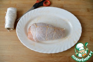 Сворачиваем голень, придавая ей изначальную форму, натираем солью, перцем, паприкой. Обвязываем нитью, чтобы голень держала форму.