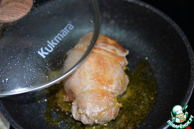 Нагреваем сковороду, кладём индейку гладкой кожей вниз. Обжариваем на среднем огне до румяности с обеих сторон. Сковорода ТМ Kukmara Granit Ultra быстро и равномерно нагревается, хорошо держит тепло. Обжаренную индейку убираем со сковороды. Масло оставляем.