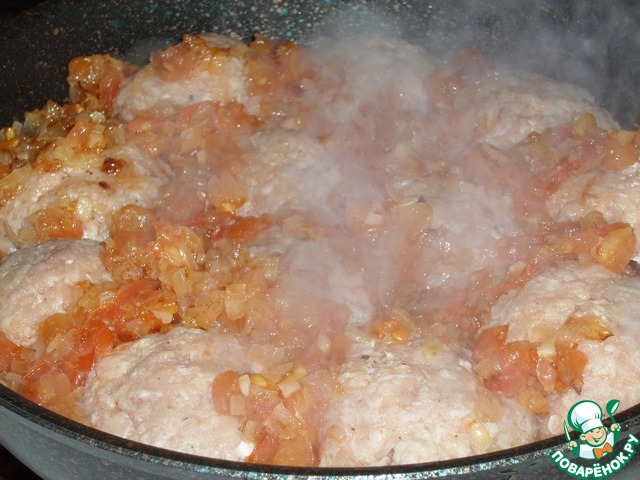 Огонь увеличиваем. Сковороду возвращаем на огонь. Выкладываем в нее куриные шарики. Масло я не добавляла, т. к. чуток масла остался от обжаривания овощей, а готовить в этой сковороде возможно, используя минимальное количество масла.