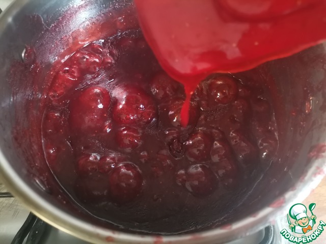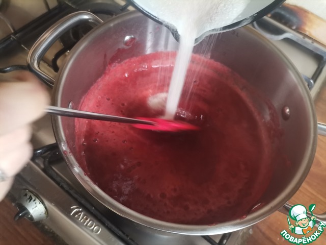 Когда пюре закипит, начинаем "дождиком" всыпать сахар с пектином, при этом интенсивно помешивая.