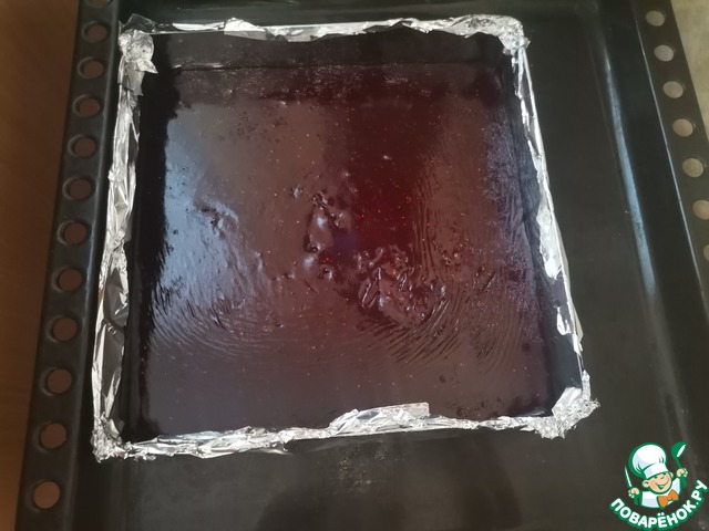 Квадратную форму оборачиваем в фольгу, ставим на противень и выливаем туда готовый мармелад. Оставляем для стабилизации не менее чем на 5 часов.
