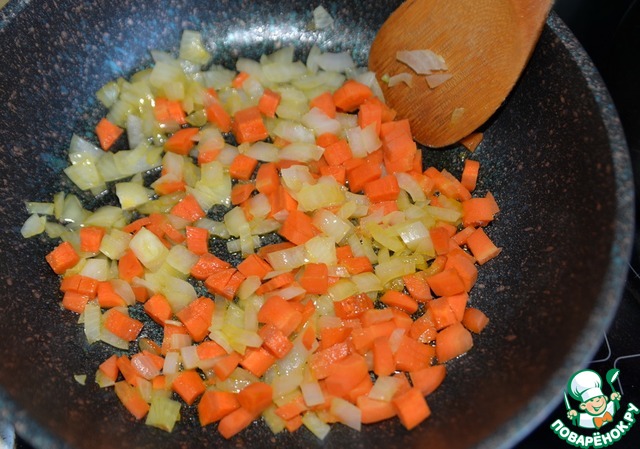 • Берём кастрюлю с толстым дном или сотейник. У меня - сковорода с высокими бортами. Нагреваем, наливаем масло, обжариваем лук и морковь на среднем огне 5 минут.