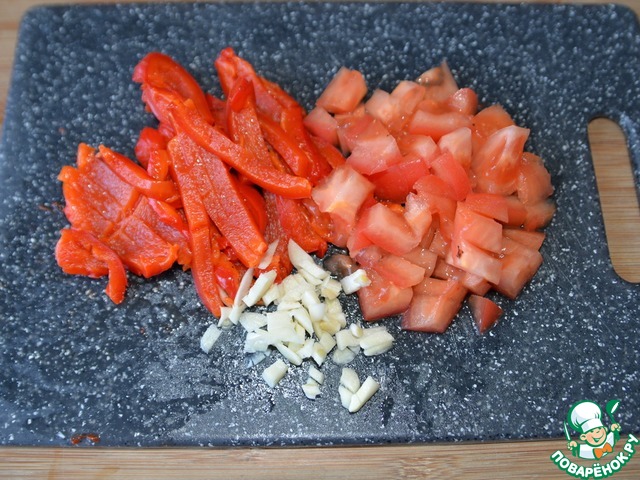 • Перец чистим, режем полосками. Помидор ошпариваем, снимаем кожуру, режем мелкими кубиками. Мелко режем чищенный чеснок.