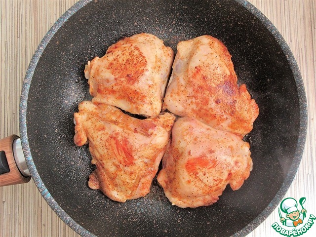 В сковороде разогреть растительное масло, обжарить куриные бедра с двух сторон до легкого румянца, выложить в удобную миску, накрыть крышкой, сохраняя тепло.