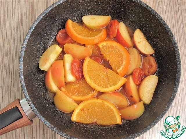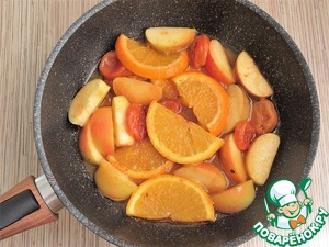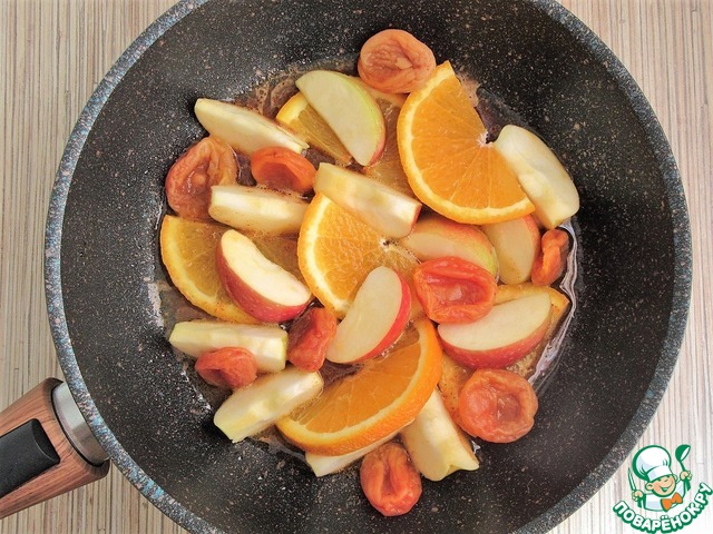 В сковороду добавить оставшийся соус от курицы, выложить нарезанные яблоки, апельсин и курагу.