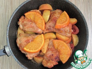 Вернуть куриные бедра в сковороду, красиво поправить фрукты. Наклонив сковороду, полить курочку образовавшимся фруктовым соусом.