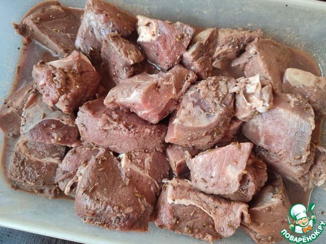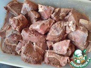 • Мясо нарезаем некрупными кусочками, добавляем все специи, солим и оставляем мариноваться. Я оставляла на ночь, но вполне хватит нескольких часов.